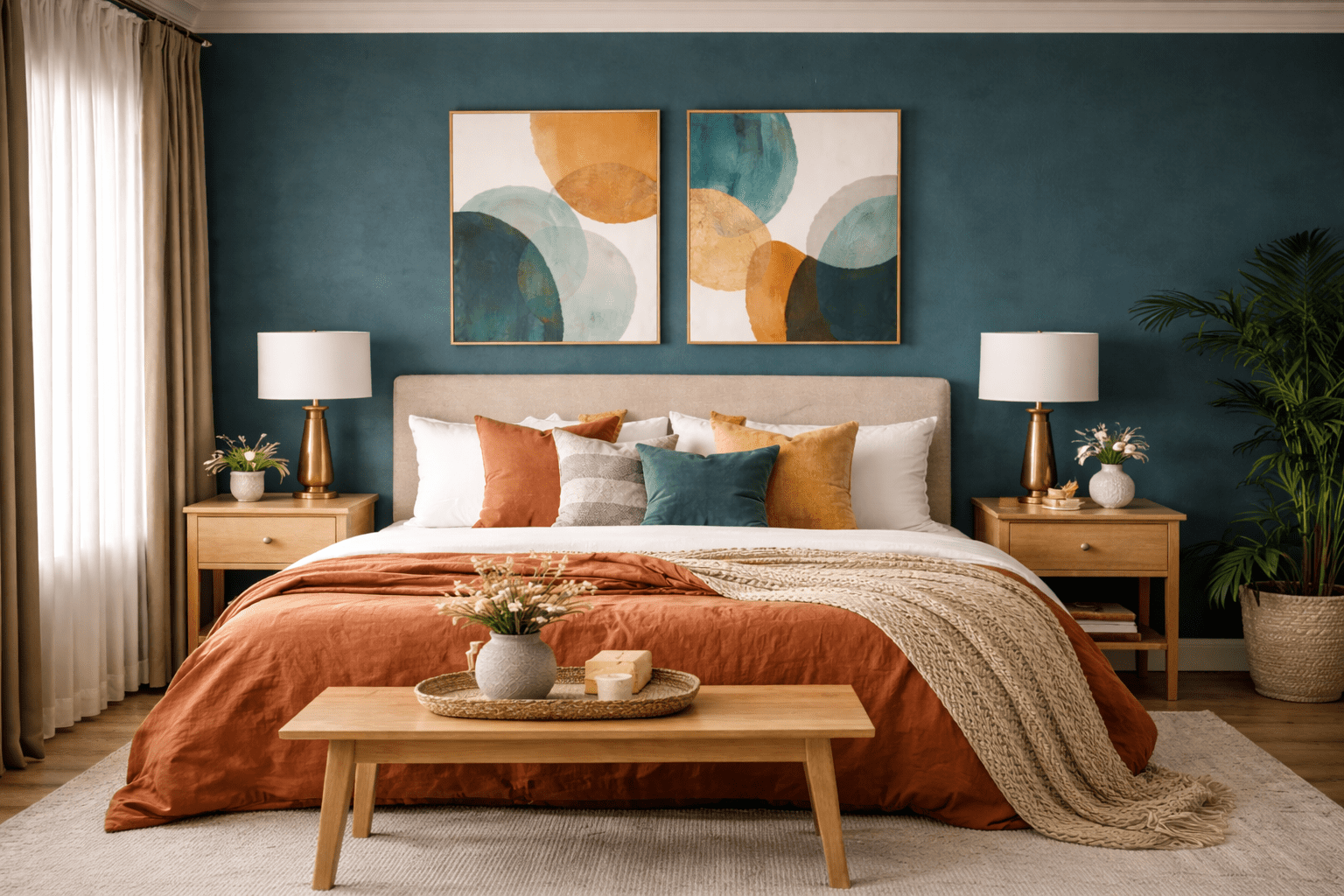 Pour une déco plus audacieuse, vous pouvez jouer la carte du contraste fort avec des couleurs chaudes. Le jaune moutarde, par exemple, s’associe très bien avec le bleu canard. C’est une alliance vive, solaire, qui évoque les décors vintage des années 60. L’orange brûlé ou le terracotta fonctionnent aussi très bien, surtout si vous ajoutez du bois foncé ou des touches cuivrées.