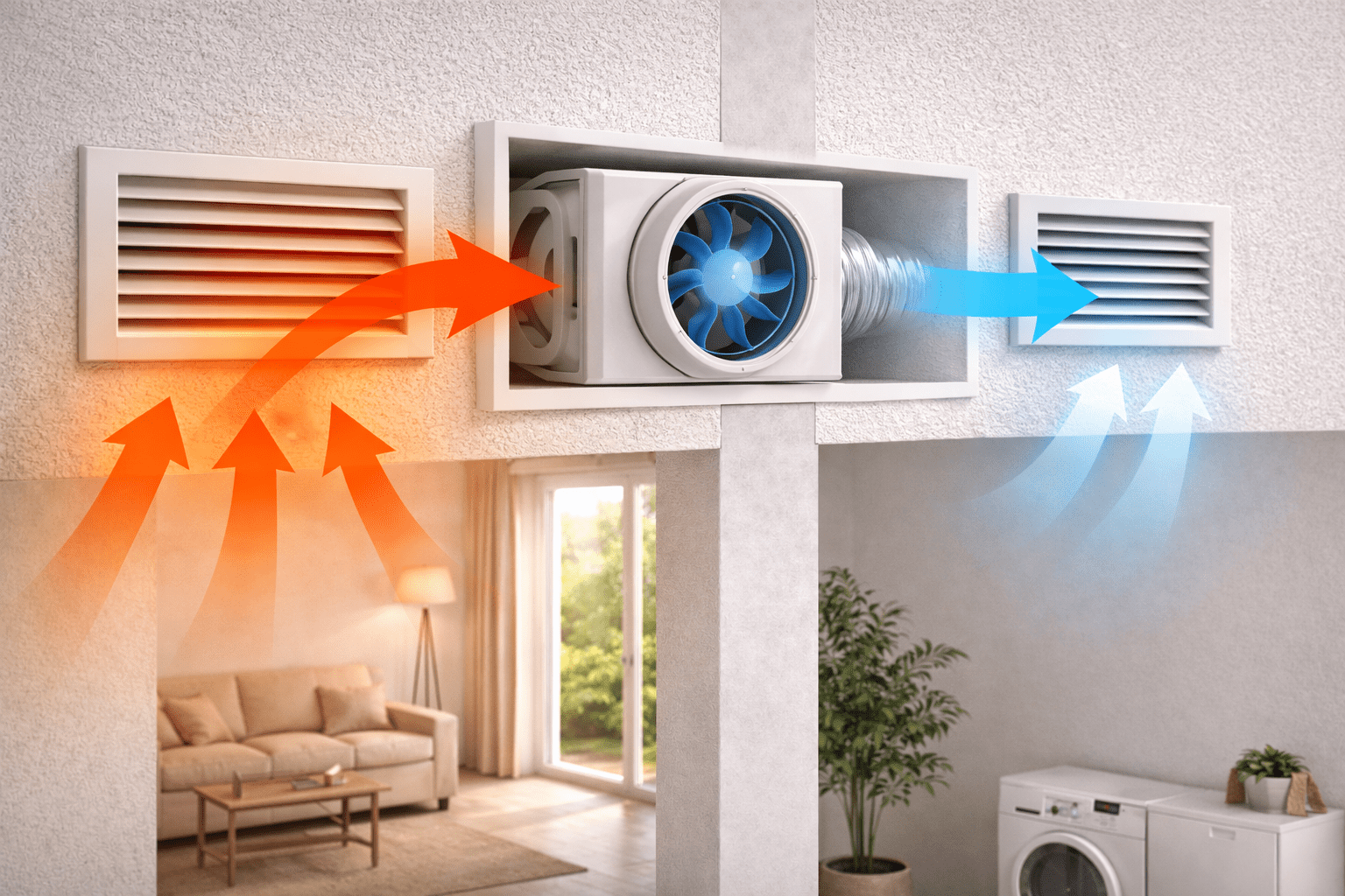 Pour que le système fonctionne correctement, il faut prévoir une entrée d’air dans la pièce d’origine (généralement en bas de porte ou via une grille d’aération), ainsi qu’un retour d’air dans la pièce de destination. Sinon, l’extracteur va forcer inutilement, et la chaleur ne se diffusera pas comme prévu.