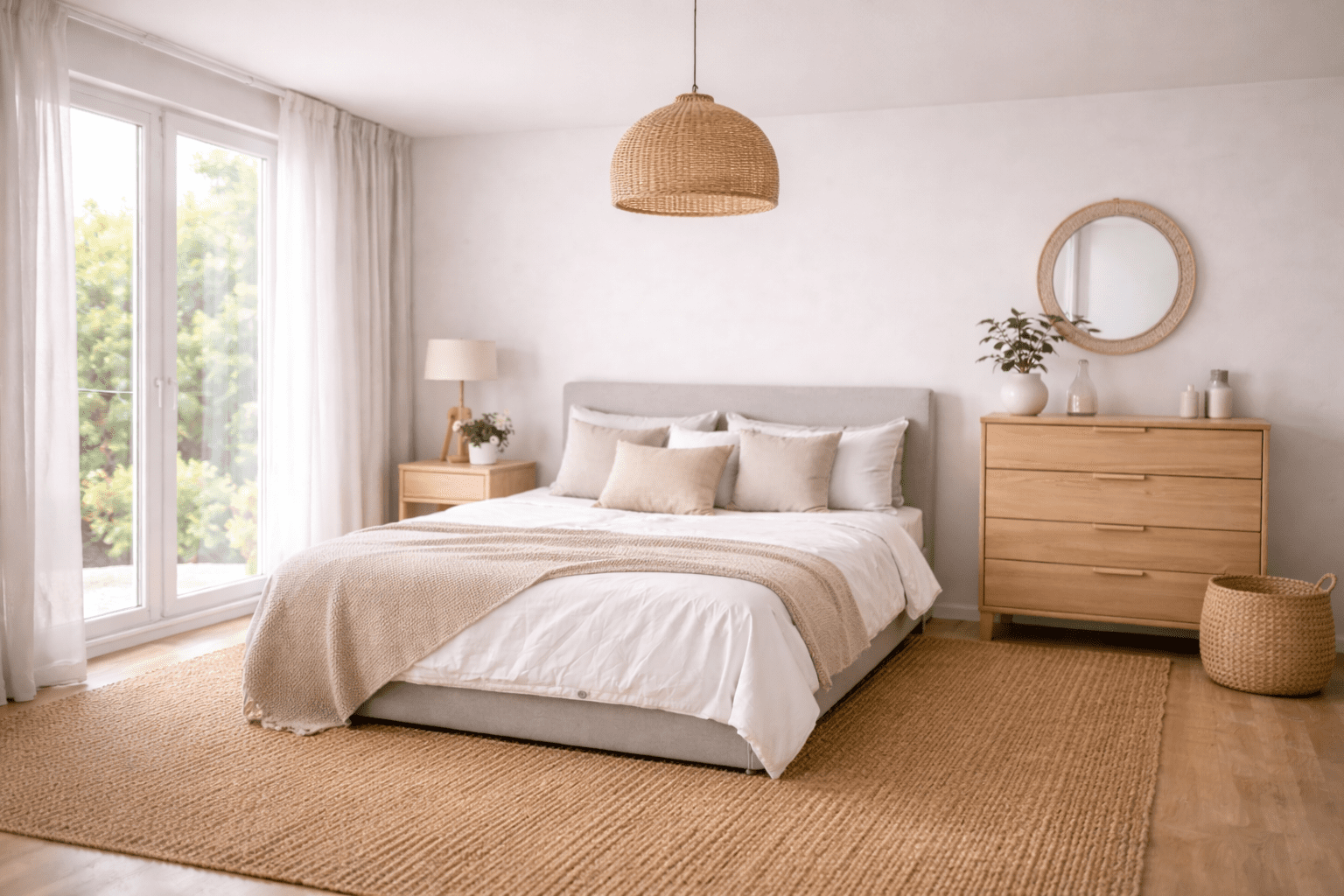 Dans une chambre au look nordique, le jonc de mer vient adoucir les lignes épurées du mobilier. Associez-le à des meubles aux formes simples, en bois clair ou blanc, et à une palette de couleurs douce (gris perle, bleu pâle, rose poudré). Quelques objets bien choisis (lampe en métal noir, plaid en grosse maille, coussins en coton naturel) suffisent à réchauffer l’ensemble. Le contraste entre la texture du sol et la simplicité du mobilier apporte de la personnalité, sans alourdir l’espace.