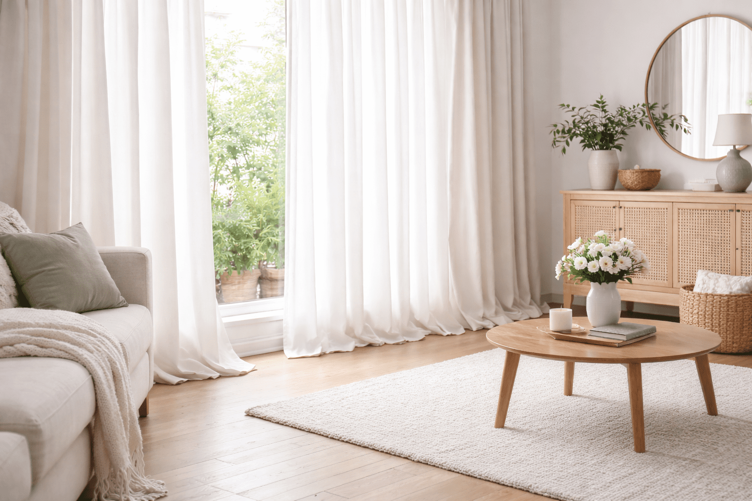 Si vous ne souhaitez pas couper, coudre ou modifier définitivement votre rideau, vous pouvez tout simplement jouer avec son tombé. Cette solution fonctionne particulièrement bien si vous êtes en location, si vous venez d’emménager ou si vous hésitez encore sur la hauteur idéale. L’idée n’est pas de raccourcir réellement le rideau, mais de l’adapter visuellement.