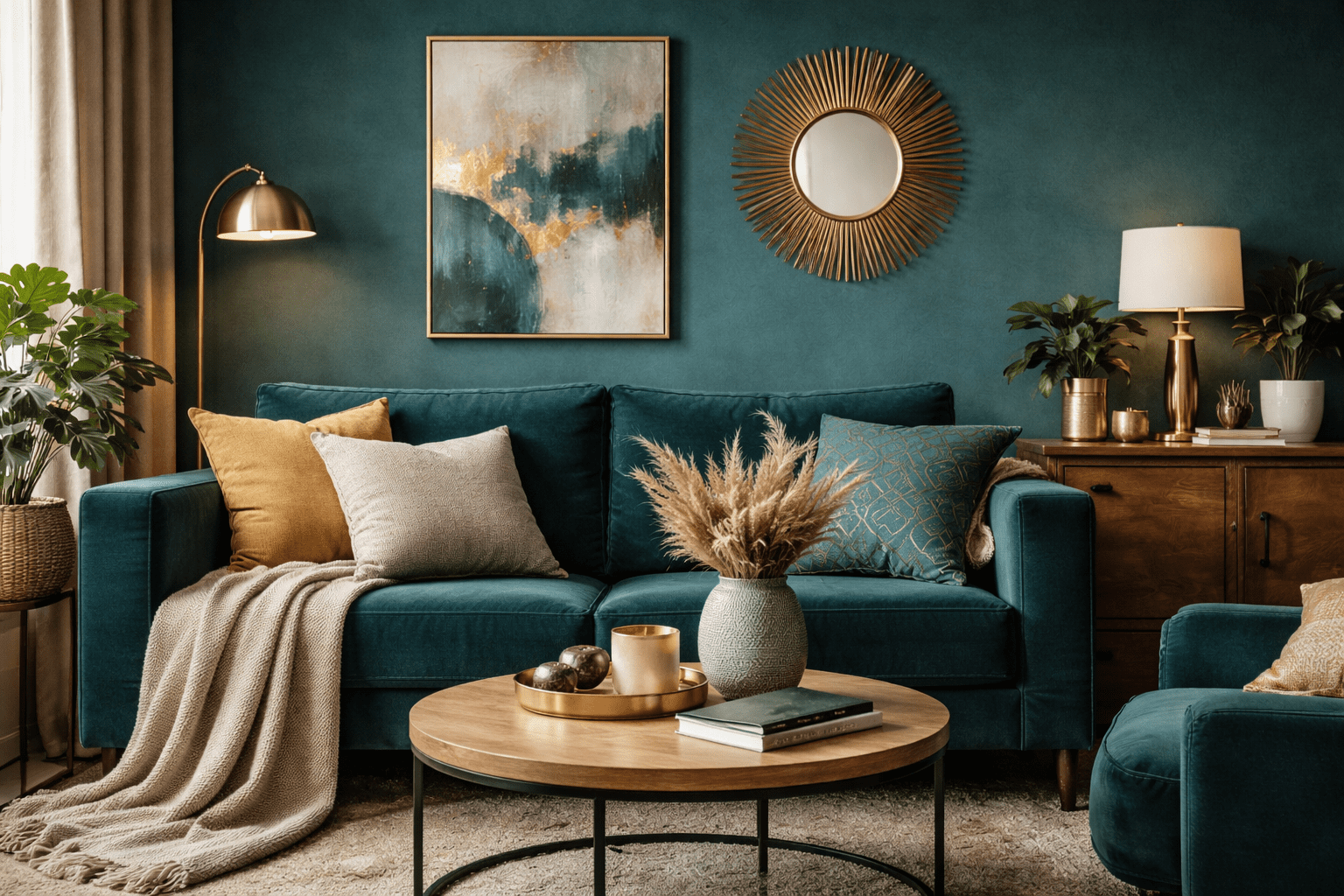 Le vert canard est sublimé par des touches de cuivre, de laiton, de jaune moutarde ou de terracotta. Ces associations créent un contraste chaleureux et donnent un aspect plus vivant à la pièce. Elles sont souvent utilisées dans les ambiances bohèmes ou vintage.